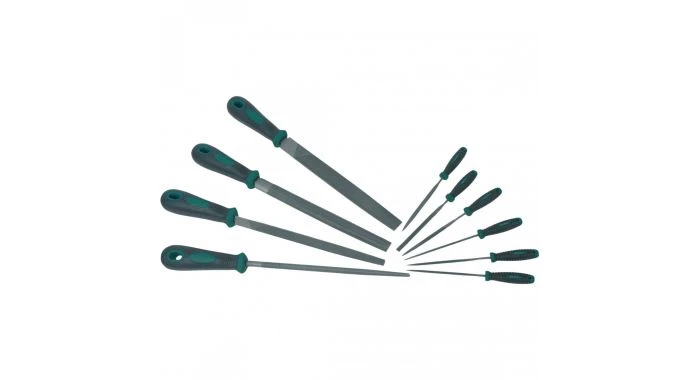 Vijlenset, 10-delig. Werkplaatsvijlen, 200 mm, dubbel gekapt, in driehoek, rond, halfrond en vlakstomp en 6 naaldvijlen, 90 mm, in driehoek, vierkant, rond, halfrond, vlakstomp en vlakspits.