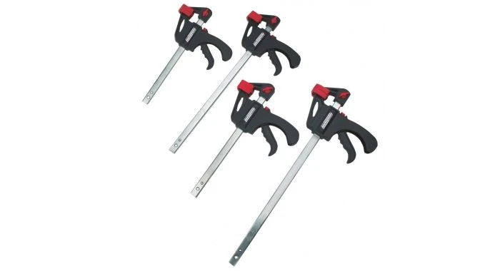 4 Span- en spreidklemmen (bereik 2 x 150 mm en 2 x 300 mm), verzinkte rail, met nylon versterkte drukplaten. Simpele eenhandsbediening, zeer licht in gebruik, grote spankracht.