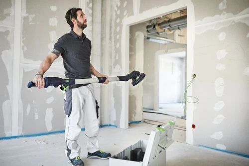 Licht aan. Wand en plafond perfect. De langnek-schuurmachine PLANEX met LED-licht.