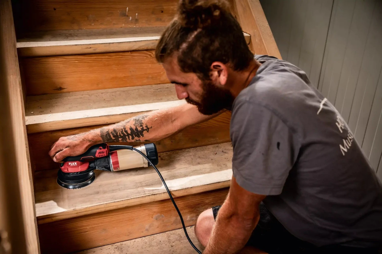 Lichte, compacte, excentrische eenhandschuurmachine bijzonder ergonomisch en trillingsarm door speciale balancering voor werken zonder vermoeidheidsverschijnselen waarbij de polsen worden ontzien