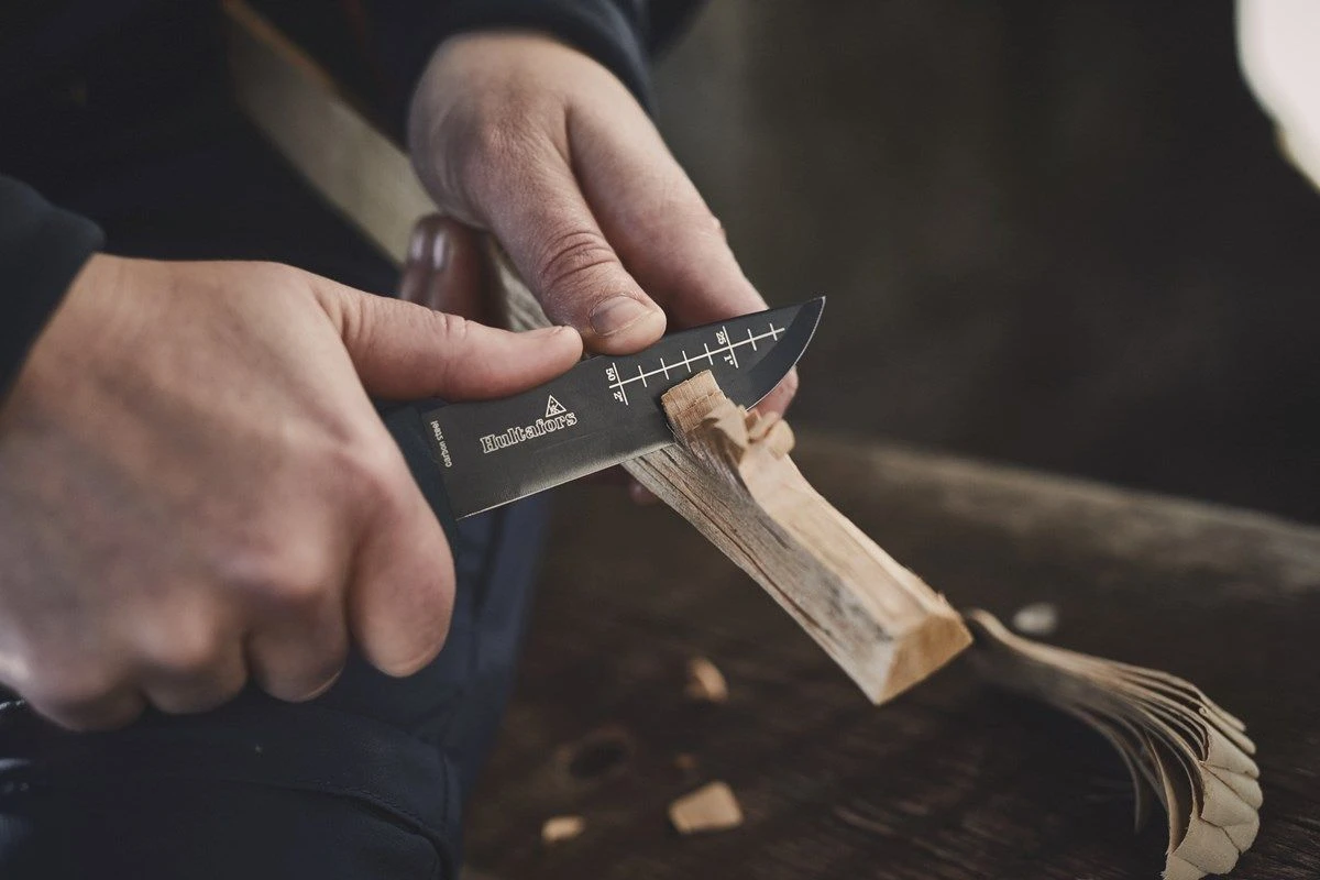 Een duurzaam outdoor mes met uitzonderlijke grip, zeer geschikt voor zware klussen in het veld. De slijtvaste riemlus is geschikt voor riemen tot 80mm breed en is voorzien van een handig vakje voor een magnesium flint. Het lemmet is scandi geslepen en is gemaakt van Japans messenstaal, het 3mm dikke carbonstaal is gehard tot 58–60 HRC en heeft een roestwerende coating (elektroforetische depositie coating). De rug van het lemmet is geribt voor gebruik met een magnesium flint.