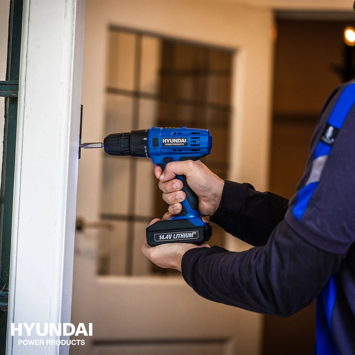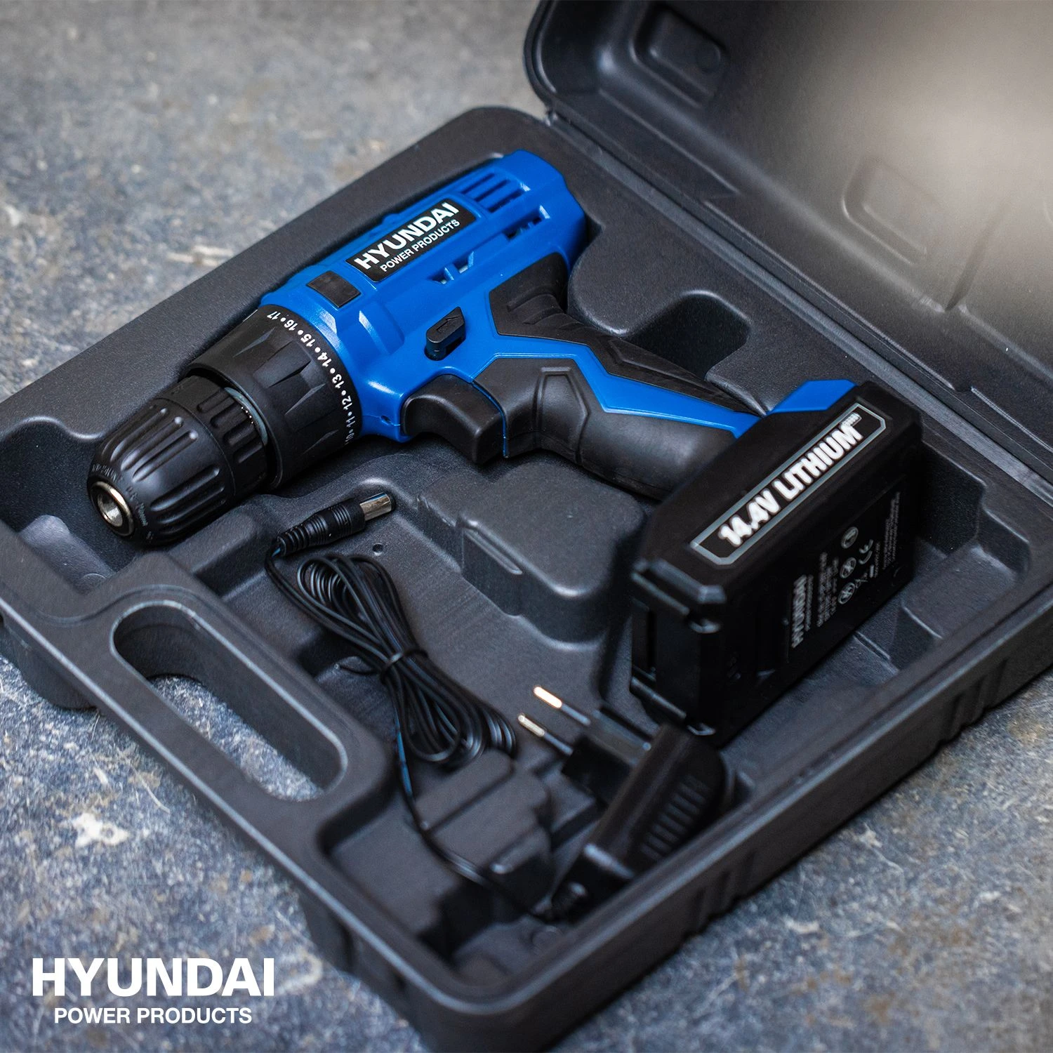Deze compacte Hyundai accuboormachine is voorzien van een 14.4 V Li-ion accu met 1.3 Ah accu-capaciteit. De machine heeft een variabele snelheid en 17 draaimoment-instellingen en is geschikt voor het met precisie schroeven en boren in gips, pleisterwerk, hout, metaal en kunststof. Het handvat is voorzien van anti-slip soft-grip en ligt prettig maar ook stevig in de hand. Een led-lampje verlicht de werkplek tijdens de schroef- of boorwerkzaamheden. De snelspanboorkop maakt het verwisselen van boren en bits zeer eenvoudig. De Hyundai accuboormachine wordt geleverd in een handige kunststof bewaarkoffer met 6 boortjes, 6 bits en bithouder.