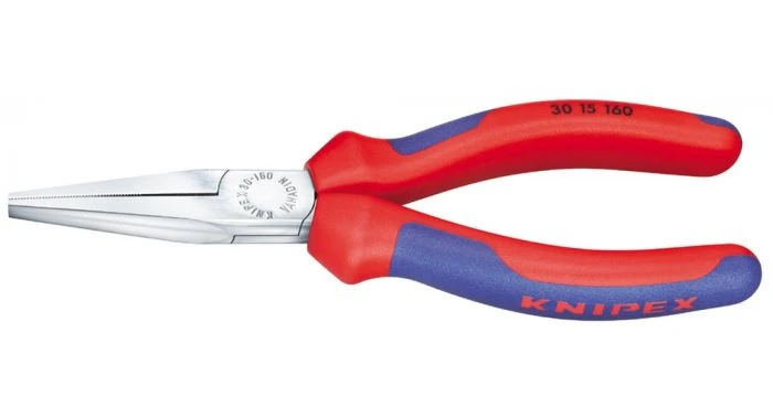 Extreem belastbaar en slijtvast. Verschillende bekvormen. Chroom-Vanadium elektrostaal, in olie gehard en getemperd. Knipex Langbektang verchr. platte bek 140 mm