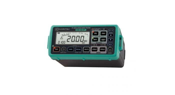 De Kyoritsu 6024PV is een multifunctionele isolatieweerstand- en aardingsweerstandtester voor met name PV-installaties. Door de toegepaste meettechniek kan de isolatieweerstand gemeten worden zonder het kortsluiten van de strings. Daardoor is deze meting veiliger en kan de meting ook overdag zonder verduistering van de panelen uitgevoerd worden. De tester is IP54 en geschikt om te gebruiken onder slechte weersomstandigheden. De compacte vormgeving en lichtgewicht uitvoering maakt de tester handig in gebruik. Het display, dat ook is voorzien van achtergrondverlichting, toont naast de meetwaarde ook de duur van de meting. De tester is geschikt voor PV-installaties tot 1000V en heeft een geheugen voor 1000 metingen. De metingen kunnen met de meegeleverde KEW Report software worden verwerkt op de PC.