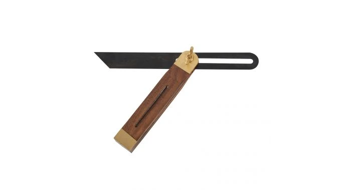 Gepolijst, hardhouten handvat met koperen eind dop en verstelvleugelmoer. Chemisch gezwart stalen blad.
