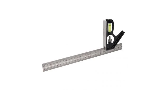 Nauwkeurige waterpas met een 300 mm lange liniaal uit gehard staal met duidelijke metrische en imperiale schaalverdeling. Gietaluminium handvat, nauwkeurig gefreesd bovenvlak en ingebouwde waterpas met kr