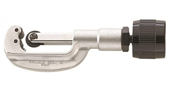 Voor koperen-, messing-, lichtmetalen-, hardkunststof- en dunwandige stalen pijp, met binnenpijpfrees (3 messen) in de handgreep, gesmeed, verchroomd.