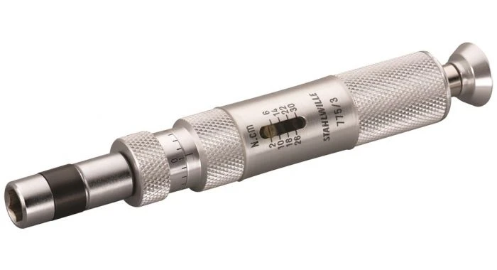 Klikkend, voor het gecontroleerd aanhalen in het cNm-bereik, voor enkelvoudig gebruik en serie-fabricage, schroefdrukveer als meetelement, voor rechtsom– en linksomgebruik, met 1/4″ binnenzeskant (F 6,3 DIN 3126/ISO1173), via micrometerschaal (draaibare schaal) traploos instelbaar, vrijloopkoppeling voorkomt het overtrekken van de ingestelde waarde, vorm en oppervlakte van de handgreep zorgt voor een betrouwbare overbrenging van het aanhaalmoment, insteekgereedschappen: alle bits met 1/4″ buitenzeskant E 6,3, zoals kruiskop, POZIDRIV/SUPADRIV®, sleuf, TORX®, zeskant; voor de kleinste schroefverbindingen worden bits met 4 mm buitenzeskant en een bithouder (adapter) nr. 3115/2 voor schroevendraaierbits model C4 en buitenzeskant 1/4″ (E 6,3 DIN 3126/ISO 1173) gebruikt, met certificaat, weergave-afwijking ± 6 %.