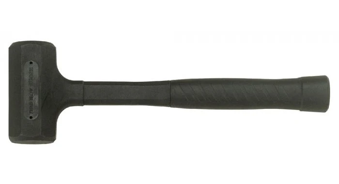 Terugslagvrije hamer. De kop is gevuld met fijne staaldeeltjes om te verhinderen dat de hamer terugkaatst bij het slaan.