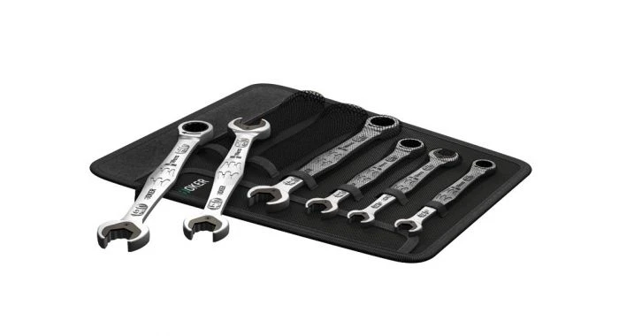 Steek-ringratel-/dubbele steeksleutel-set. De Joker kan in zo goed als iedere situatie schroeven met hoge snelheid en precisie. Het vastzetmechanisme aan de ringkant heeft een uitzonderlijk hoog aantal van 80 tanden en is zeer flexibel te gebruiken, ook wanneer de ruimte beperkt is. De speciaal gesmede geometrie in combinatie met hoogwaardig chroom-molybdeen-staal en nikkel-chroom-coating heeft drie voordelen: een zeer lange levensduur, hoge slijtvastheid en een langdurige bescherming tegen corrosie. In stevige tas