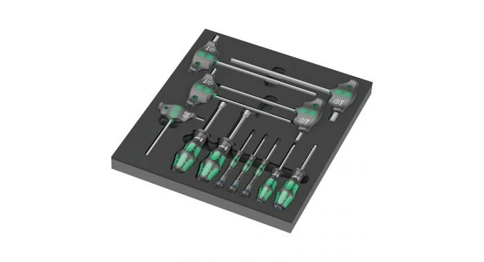 Duurzaam schuimrubberen inzetstuk; tweekleurig voor snelle identificatie van ontbrekende onderdelen; passend voor de Tool Rebel gereedschapswagen, voorzien van 10 Wera schroevendraaiers (werkplaats, Micro en T-greep) voor binnenzeskantschroeven en 2 Wera schroevendraaiers met holle as voor buitenzeskantschroeven.